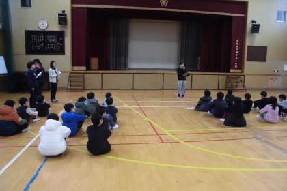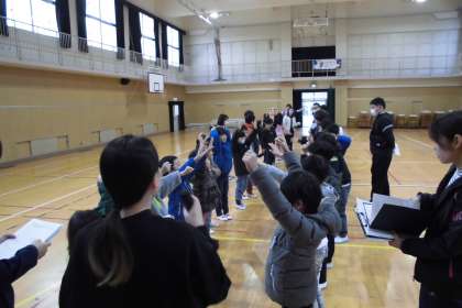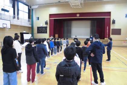 2月26日(月)の朝、1年生から5年生が講堂に集まり、卒業を祝う会の練習をしました。