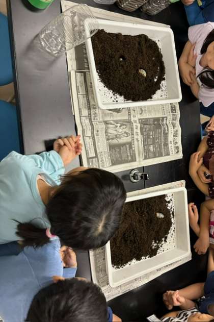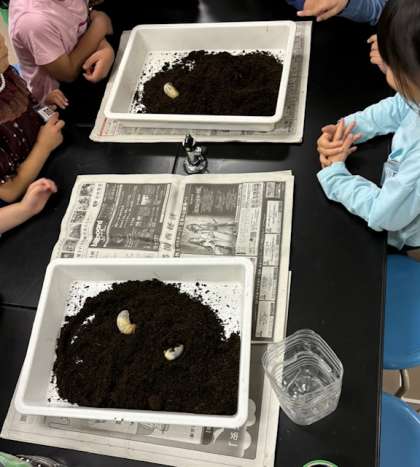 理科の時間だけでなく、15分休みには1・2年生もカブトムシの幼虫を見に来てくれました。カブトムシの幼虫がこんなに大きいのだと初めて知る児童がたくさんいました。