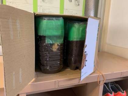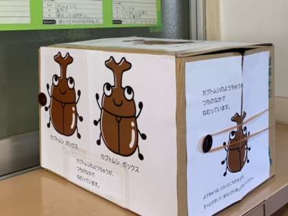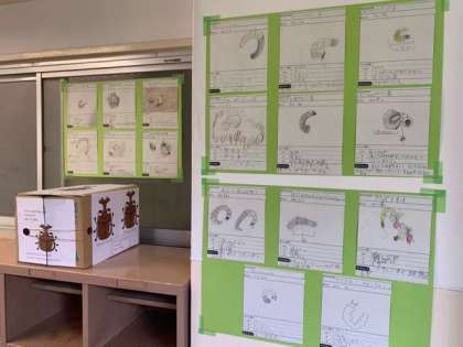 カブトムシの幼虫の観察を行いました。子どもたちの観察カードとともに職員室前に観察コーナーが出来上がりました。
