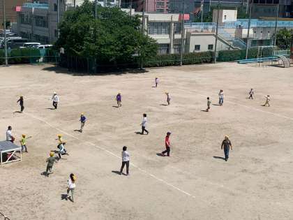 快晴の中、今日も元気に遊んでいます。校長先生はじめ大人も11人出て一緒に遊んでいました。