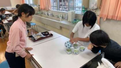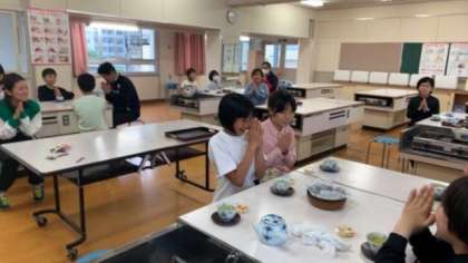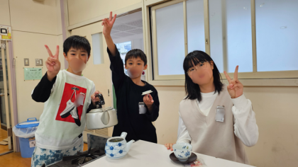 家庭科で、5年生が6年生をお茶会に招待する学習がありました。コンロの使い方とお茶の入れ方を学ぶとともに、5、6年生の仲を深めることもねらいでしたが、ねらいはバッチリ達成されました。5年生はもてなそうと一生懸命頑張り、6年生も称賛とお礼の言葉で返しました。「こんな機会は中々ないので嬉しかった」「また一緒にしたい」と5年生から笑顔いっぱいで感想がとんだとても温かい授業でした。