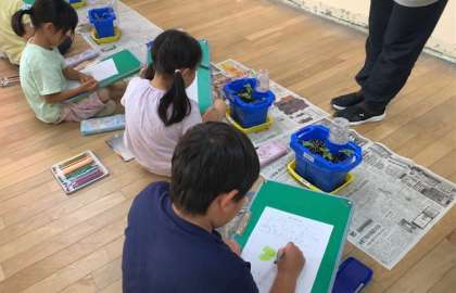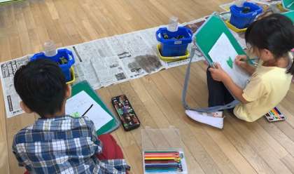 アサガオの観察です。みんな芽が出てきました。葉も黄緑と濃い緑を塗りあわしたり、葉脈をしっかりかいたり、茎の部分の紫色に注目したり、みんなそれぞれがよく観察をしてカードにかいていました。