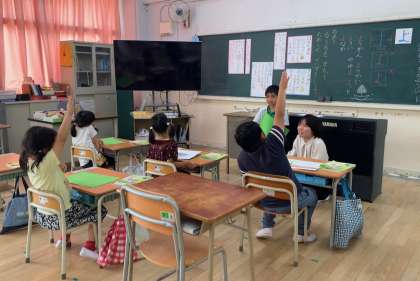 1年生は国語科の学習でした。普段行っているひらがなの学習の様子と、つくったクイズのやり取りを通して話す聞く力をつける学習でした。