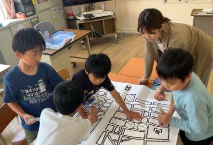 2年生は生活科の学習でした。まちたんけんに行ったことの振り返りで、みんなでまちたんけんマップを作りました。
