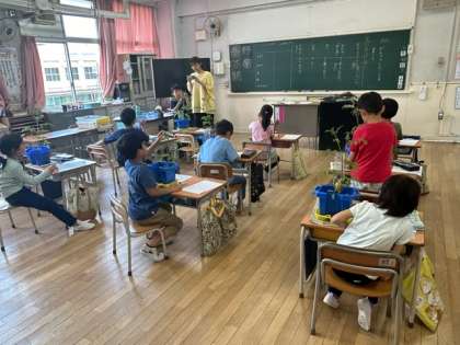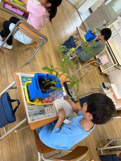 約1ヶ月前に植えたミニトマトの苗を観察しました。毎日、水やりのお世話をし、大きく成長しています。