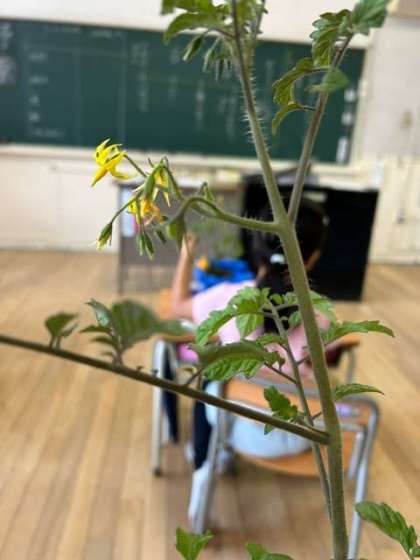 茎が前より太くなり、花が咲き始めています。「あっ、トマトができてる!!」と小さな実を見つけた子もいました。