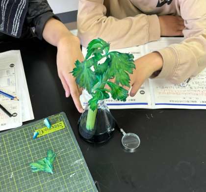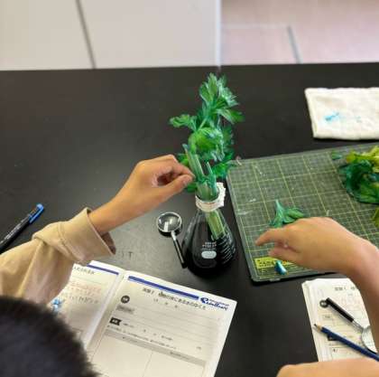 根から取り入れられた水は、植物のどこを通って、体全体に行き渡るのか、色水を吸わせたセロリを使って、実験、観察していきました。
