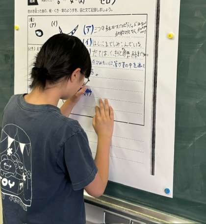 色水を吸わせたセロリを見てすぐに、葉の先まで色がついていることに気づきました。実験・観察後の発表では、水の通り道を図や文を使って発表していき、根も茎も葉も水の通り道(管)があることを体全体に行き渡っていることに気づくことができました。