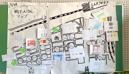 今は国語の物語の学習の様子や、学習参観で作っていた町たんけんマップ完成版が掲示されていました。