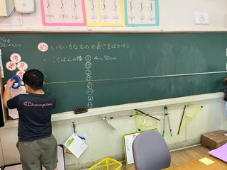 算数科では、自分たちのまわりにあるものの長さを測りました。