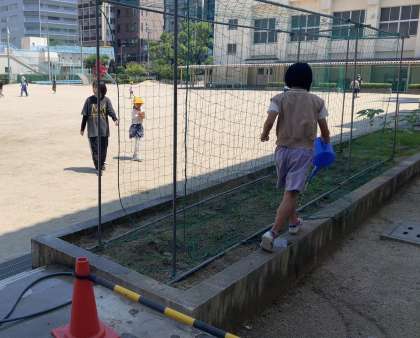 お昼休み、運動場で元気に遊んでいる子たちの傍ら、黙々と植物に水をあげている子がいました。早く済ませて遊ぶぞ!という様子もなく、何往復もしては丁寧に水をあげています。日直の仕事だからと言っていましたが、西中島小学校はこうした陰日向なく取り組む子たちで溢れています。