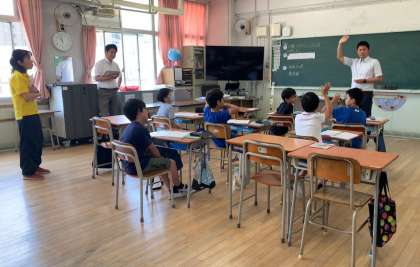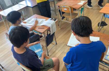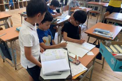 教育実習生による研究授業でした。小数の大きさを比べる学習で、位取り表を使って調べる人、数直線を使って調べる人に分かれました。グループで話し合い発表していました。その後練習問題に取り組みましたが、みんなよく理解していました。
