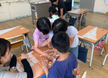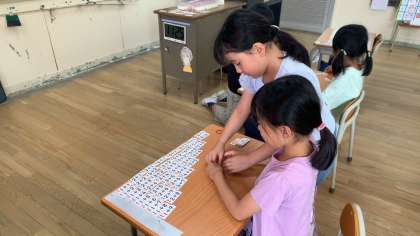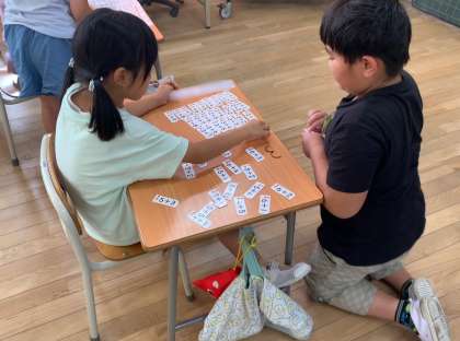 計算カードを使って学習していました。みんなで教え合いながらカードを並べ、出来上がると「すっきりしたー!」と声をあげ喜んでいました。
