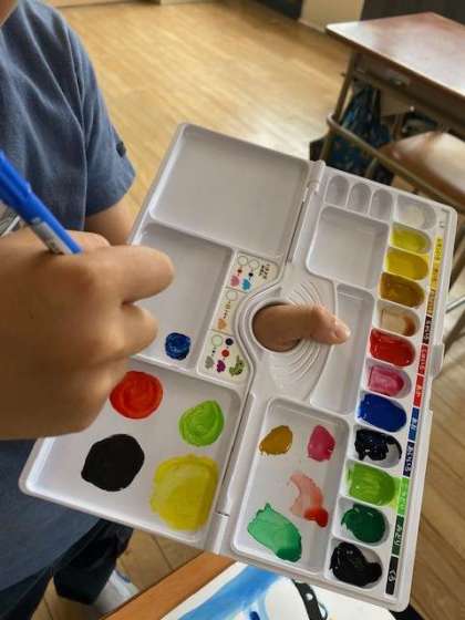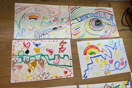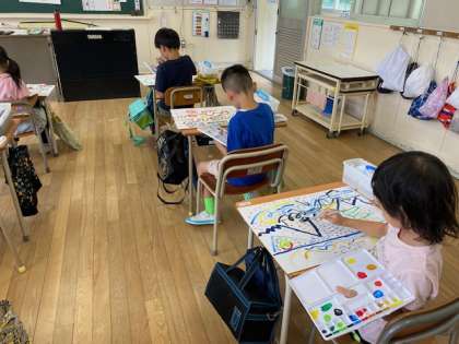 今日はいよいよたくさんの色を使って画用紙いっぱいに好きな線や点を描きました。