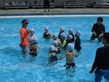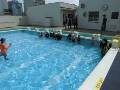 水の中では、歩いて移動したり、顔を見ずに津得たり、動物のまねっこ遊びをしたりして楽しみました。
