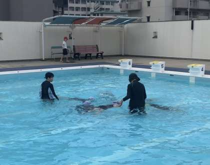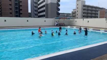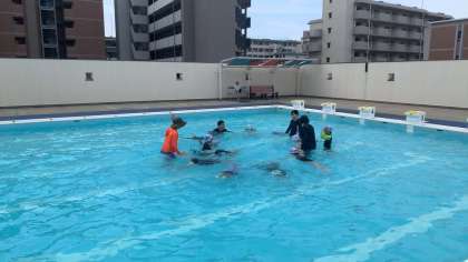 今日は浮く、もぐることを意識した動きをたくさんしました。手をつないでお互いに浮くことは、はじめペアからスタートしましたが、次はグループで、最後はみんなで大きなひとつの輪となって浮きました。