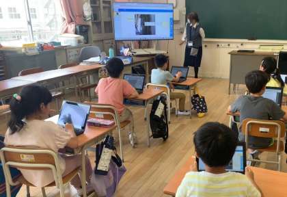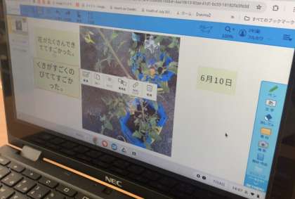育てているトマトを撮影し、それにコメントをつける方法をICT支援員さんに教えてもらいました。文字の書き方(手書き入力)や文字の大きさの変え方など、教えてもらったことを早速生かして、素敵な観察日誌を作ることができました。