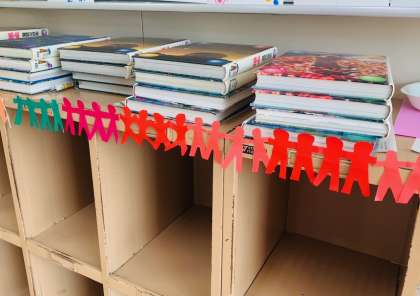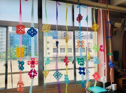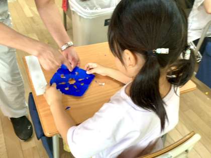 図画工作ではさみを使った工作に取り組んでいました。折り紙を折ってはさみを入れて、広げたらどんな形が出来上がるかなと、みんなたくさんの作品を作っていました。