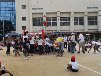 西中島の運動会は地域の方々、PTAの方々と子どもたちが一緒に行う競技があります。綱引き・玉入れをしました。大変盛り上がりました!