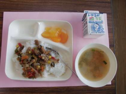 本日のメニューは、「夏野菜飯」「パワースープ」「トロピカルゼリー」「牛乳」です。