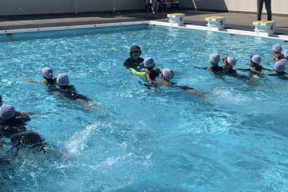 今日で1、2年生のプールの学習が終わりました。みんなで円になって浮いたり、ビート板を使って浮いたり、バディの肩を持ってバタ足をしたりしました。最後は宝探しをして楽しみました。