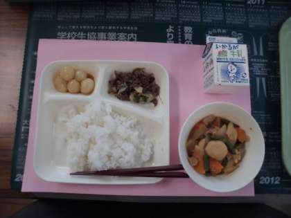 本日の給食の献立は、ごはん、一口がんもとさといものみそ煮、牛肉と野菜のいためもの、みたらしだんごでした。
