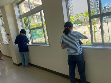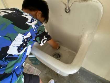 ずっと掃除をしていなかったトイレ前のシンク、運動場に面している廊下の窓(蜘蛛の巣が張っているところもありました!)の汚れを短い時間で一生懸命掃除しました。