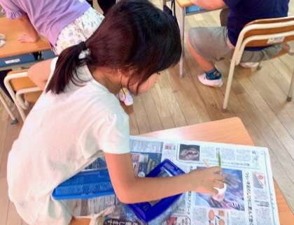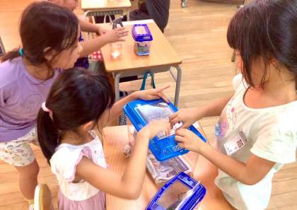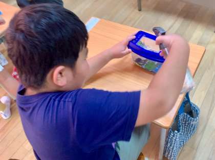 学校のバッタを捕まえて飼育しています。「バッタは水飲むんやでー!」「この草も食べるねん」「育ててていいのは1人2匹までやねん」とキラキラした目でたくさん教えてくれました。