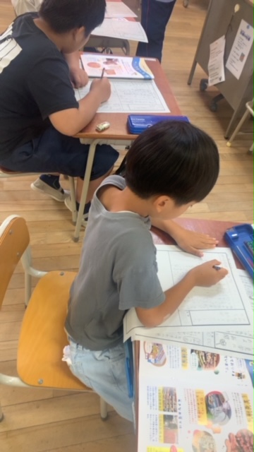 先日見学に行ったスーパーマーケットでの学習の振り返りとして、新聞作りに取り組んでいました。みんながスーパーの秘密について教科書とは違う冊子を何やら見ているなと思い近づくと、見学に行かせていただいたスーパーマーケットが作られている資料でした。子どもたちの良い振り返りになっていました。