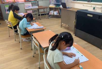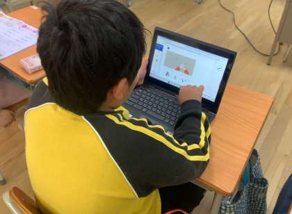 1年生は算数ドリルやパソコンでの学習アプリ、読書など、課題に合わせて自分で学習を進めていました。「先生見て!シール!!全部正解しないともらえないんやでー!」と楽しみながら取り組んでいました。