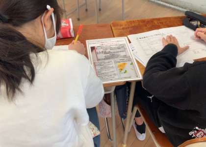 6年生は「食品表示について知ろう」ということで、実際の食品表示の写真を見て、何が書かれているのか調べながら、その意味や書かれている理由を学習しました。