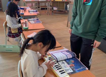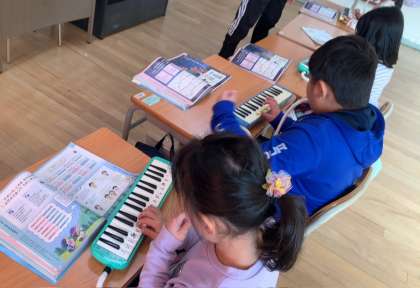 ? 鍵盤ハーモニカで「きらきらぼし」を演奏しました。まだ指使いがおぼつかないこともありますが、上手になろうとみんな懸命に練習していました。