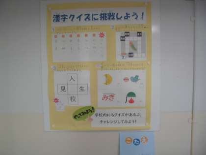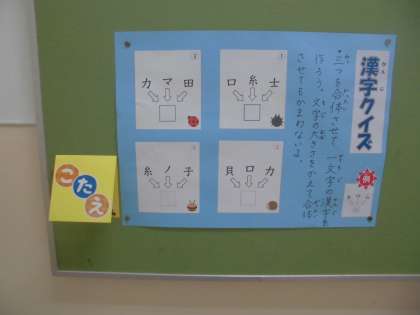 「漢検」本番が近づく中、現在校舎内の廊下に、漢字クイズを掲示しています。