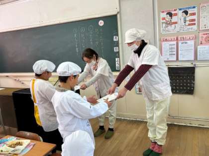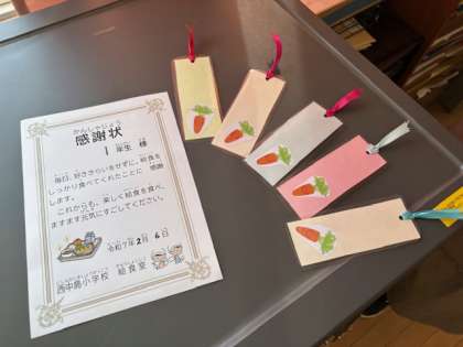 今日は、「いつもしっかり食べてくれてありがとう!」と、調理員さんから感謝状と一人一人に手作りしおりをいただきました。子ども達はおいしい給食を食べながら、さらに笑顔になっていました。