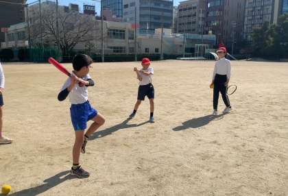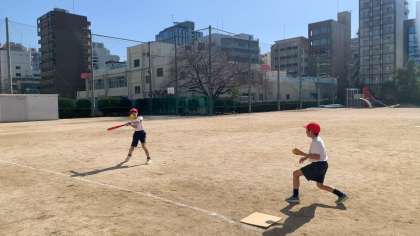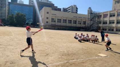 ベースボール型ゲームに取り組んでいました。チーム練習ではできる子が周りに優しく教えており、みんなも少しずつ打てるようになっていました。
