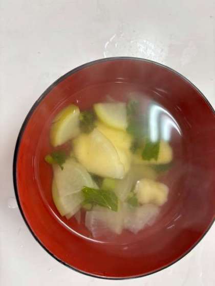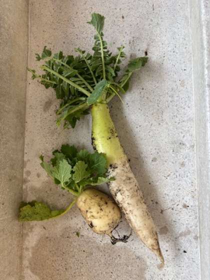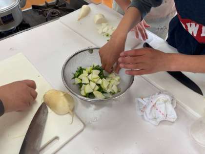 大根とかぶは、学校の畑でとりました。小麦粉をこねて、塩と醤油で味付けしました。