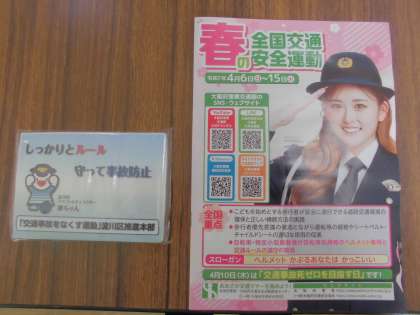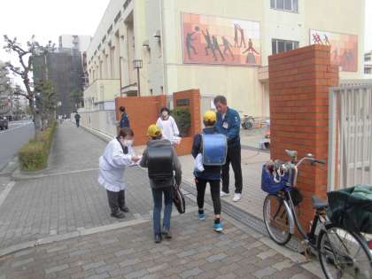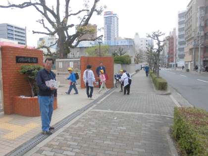 西中島地域では、淀川区セーフティーネット、西中島女性会の方々が、校門の前で啓発用のチラシとティッシュペーパーを配り、交通安全を呼び掛けていただきました。