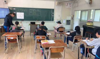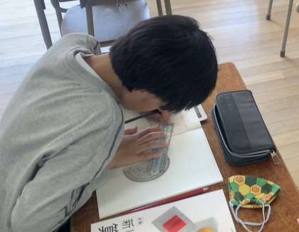 対称な図形の学習です。分度器や定規を使って図形を調べていました。