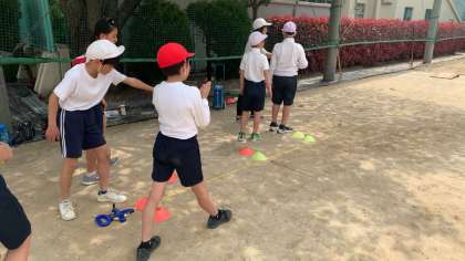 走り幅跳びを行っています。ただ「遠くまで跳ぼう!」だけではなく、リズミカルな助走から強く踏み切って跳べるように、様々な工夫をしていました。