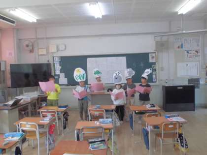 お面をかぶり、役になりきって、大きな声で読むことができました。