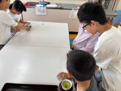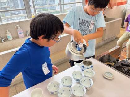 5年生は湯の沸かし方やお茶の入れ方を学習し、それを活かして6年生を招待しました。