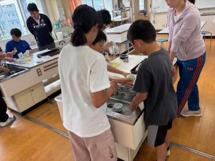 6年生は、お返しに家庭科室で実習した時の片付けの仕方を教えました。