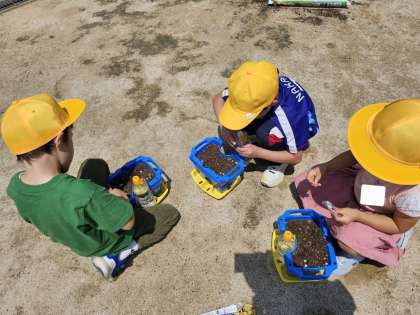 生活科の時間に1年生はあさがおの種まき、2年生はミニトマトの苗を植えました。