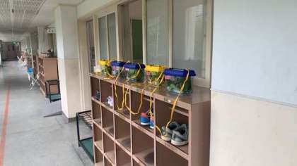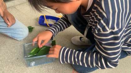理科の学習の一環でアゲハチョウを育てています。下駄箱の上にはみんなの幼虫がずらり。みんな大事に育てています。