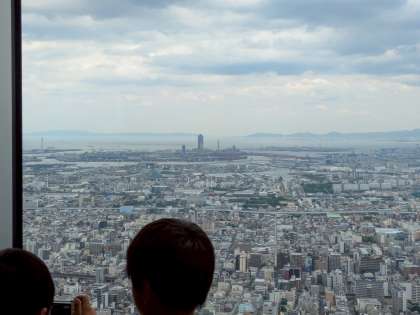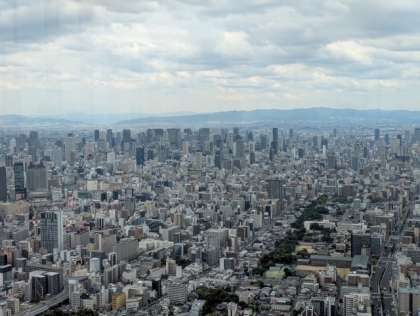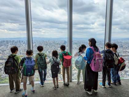 あべのハルカスに社会見学に来ています。あべのハルカスから東西南北の街並みを見て、方角によってどのような違いがあるのか見学しています。