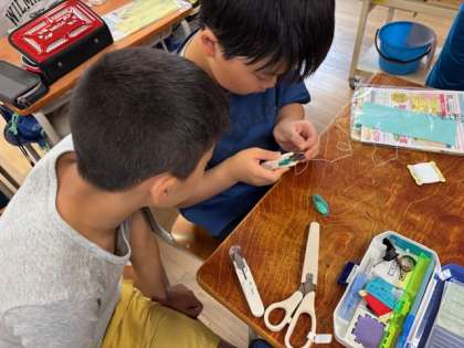 5年生の家庭科「初めてのソーイング」で、糸通し、玉結び、玉どめの仕方を6年生から教えてもらいました。
