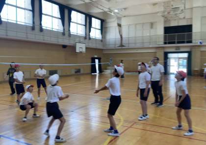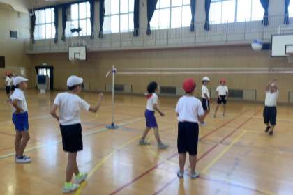 ソフトバレーボールに取り組んでいます。キャッチしていい人をつくったり、何回で返さないといけないことにするかルールを話し合ったりして、どうすれば誰もが楽しみながらバレーができるか考えながら取り組んでいます。