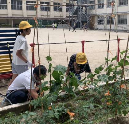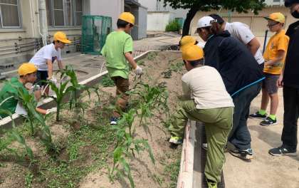 なかよし学級では「なかよしファーム」と称して野菜の栽培活動をしています。今日は畑に雑草が広がってきたこともあり、全校に放送で手伝いを呼びかけて昼休みに雑草抜きを行いました。