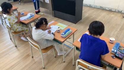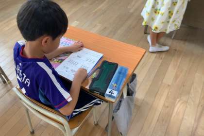 計算ドリルを使ってたし算のふりかえりを行なっていました。各自で出来たら先生に見てもらって進めていきます。ブロックを使って確かめる子や、計算の後一つ一つ数えて答えの見直しをする子など、自分なりに学習に取り組めていました。