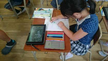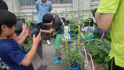 本校では、ICTを活用したわかりやすい授業をめざして、授業研究会を行っています。6月24日には、2年生が「大きくなあれわたしの野さい」という単元で行いました。タブレットを上手に使いこなし、野さいの栽培に関心が高まりました。